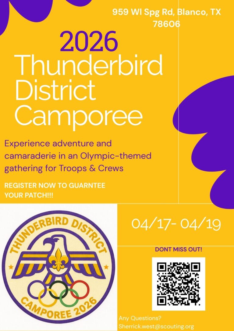 The Thunderbird district is the southernmost local division of the Capitol Area Council. Our nine Cub Scout packs welcome elementary school children of all genders and their families to join in scouting fun together. Our ten BSA Troops provide opportunities for leadership, friendship, and adventure to boys and girls ages 10 to 18. Our two Venturing Crews enable youth ages 14 to 21 to master Scouting skills. Previous Scouting experience is not needed to join any level of Scouting America.